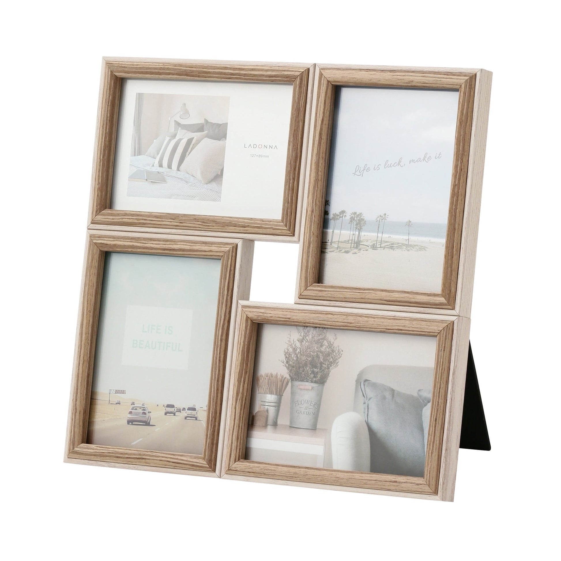 A wood frame with warm colors that allows you to lay out photos vertically and horizontally.Four L versions (8.9 x 12.7 cm) can be displayed.