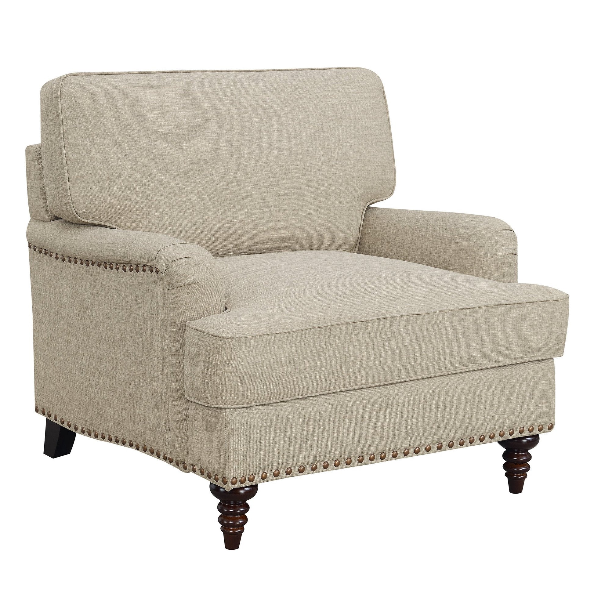 The Abby Chair is the perfect addition to your home! This chair comes in a transitional color, making it easy to pair with any existing décor. The chair features slightly rounder arms and detail piping along the cushions. Nail head trim is present along the outer edges and base of the chair, adding extra flair to this already stylish piece. The turnip style feet brings a touch of traditional style. Foam cushion filling will have you never wanting to leave, making it the perfect choice for your living room!