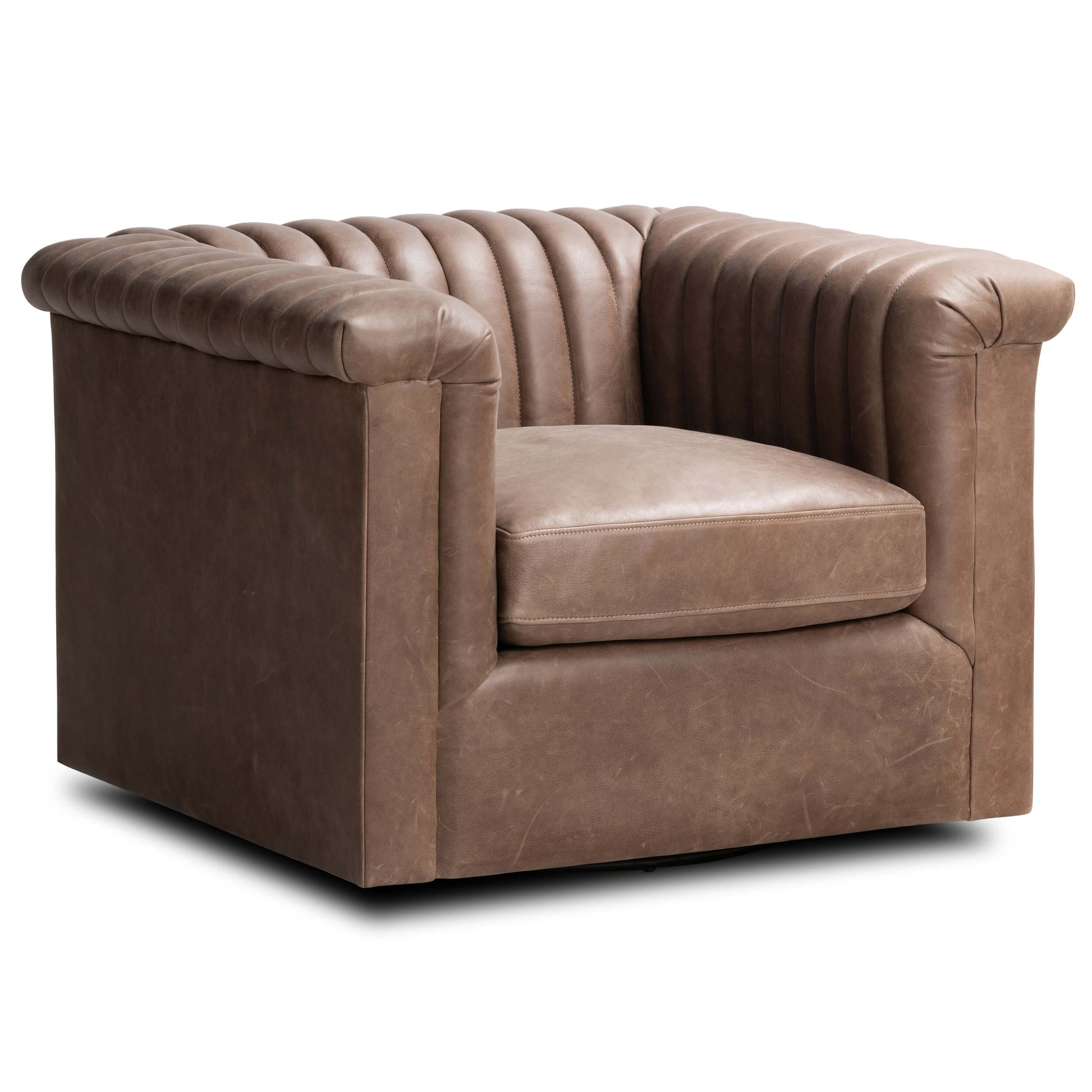 Experience a modern twist on tradition with the Watson Leather Swivel Chair. Its squared arms offer a contemporary reinterpretation of the classic English roll arm, while vertical channeling adds a touch of texture and sophistication. The chair effortlessly swivels, offering flexibility and style in one. Upholstered in a thick-cut leather, its natural graining provides depth and character. Embrace both comfort and elegance in this uniquely designed chair.