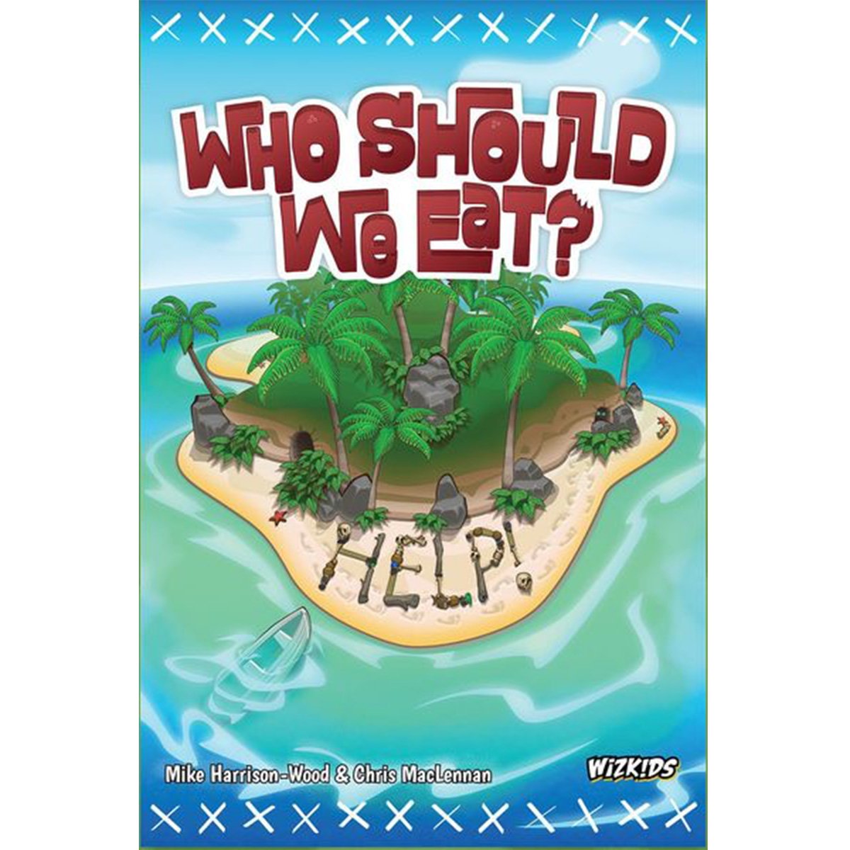 Who Should We Eat? is a lighthearted social game about plane crash survivors trying to get off an island. The only way off is to build a raft. Players play cards to gather resources for the group – adding food, sanity, and wood for the raft. Unfortunately, food is scarce and people are edible. Trials will be held to choose the survivor to sacrifice his or her life - or sometimes a knife fight will determine the person being eaten. For the survivors, this means a loss of sanity, but it also means their raft need not be as large!